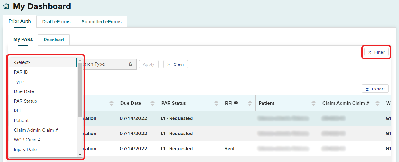 In addition to filtering your dashboard, you can export the My PARs tab of your dashboard to a .csv file using the Export button. The export will include PARs from all pages of your dashboard.
