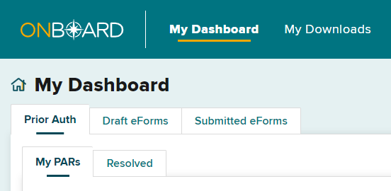 The home screen for OnBoard is a view of My Dashboard, which will allow you to access active prior authorization requests (PARs), along with saved drafted responses, submitted, and resolved PARs. The default view is to My PARs, where you will find all PARs that have been assigned to you for review. The My Dashboard link in the navigation menu will take you to the home screen.