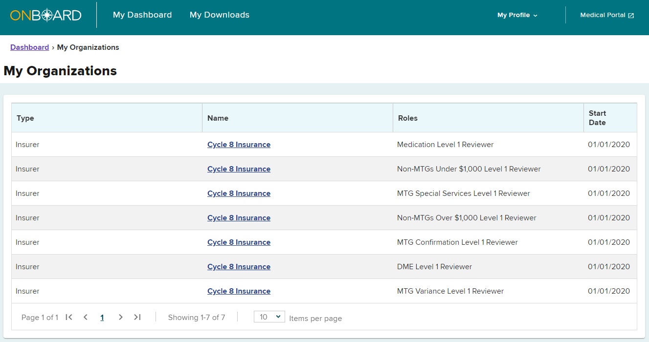 My Organizations will show each organization with which you are associated. The organization's type, name, and start date are listed, as well as your role with the organization.