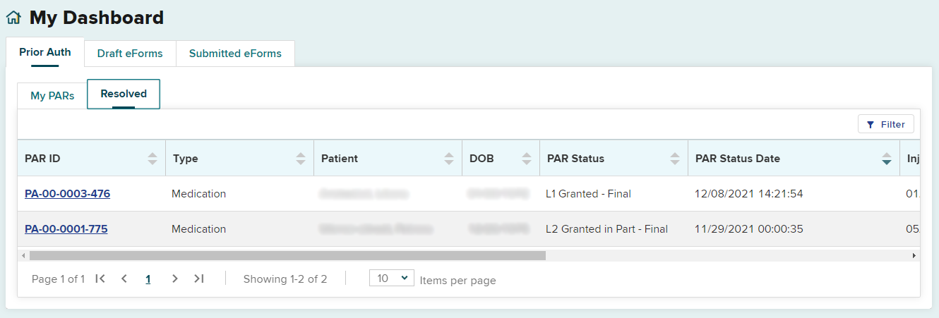 The Resolved tab is a list of PARs you have responded to that have received a final decision from the payer and cannot be escalated by the health care provider, or PARs for which the Board's Medical Director's Office has issued a decision.