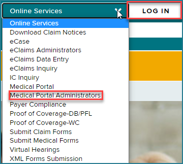 Select 'Medical Portal Administrators' from the 'Online Services' dropdown and select 'Log In'.