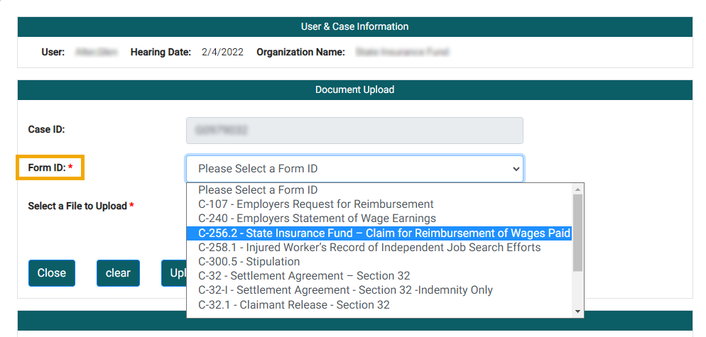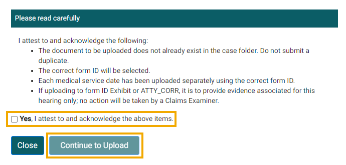 - If the document is correspondence or will be used as an exhibit for the hearing, then select the appropriate form ID. No action will be taken by a claims examiner on uploaded documents.