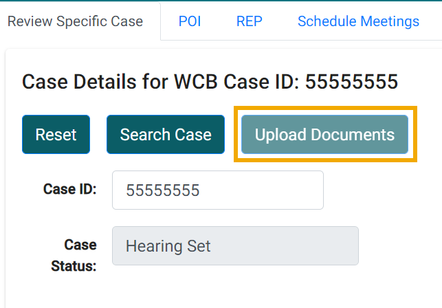 Only cases with a Case Status of Hearing Set, up until and including the day of the hearing, will allow you to select the Upload Documents button.