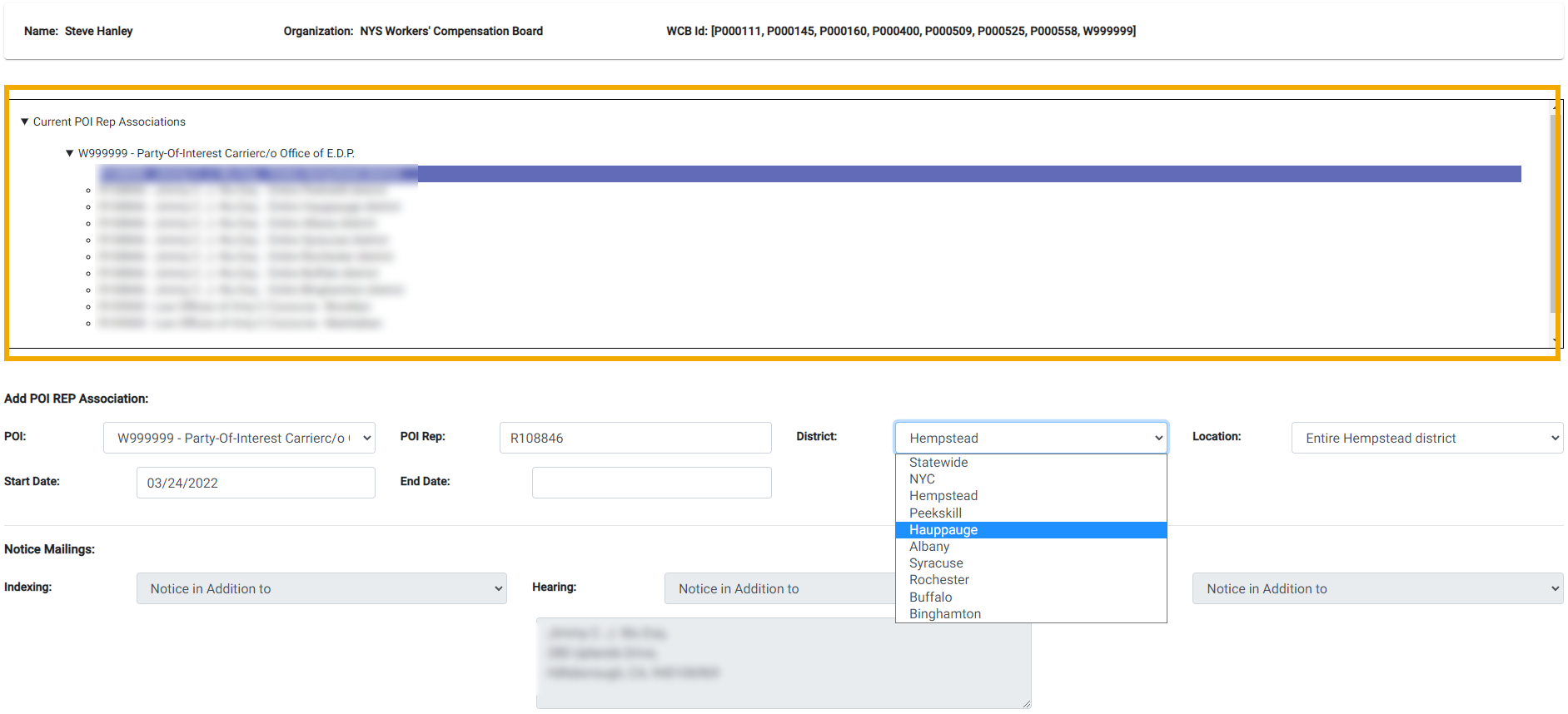 - The new representative's information automatically floods the Add POI and Association section. The new representative's name and address are displayed.