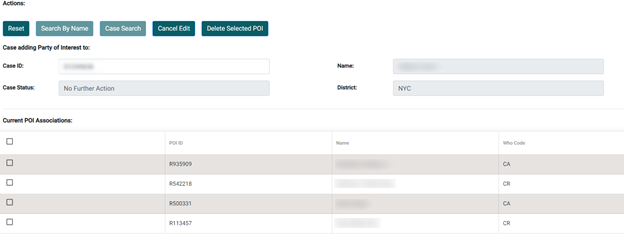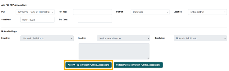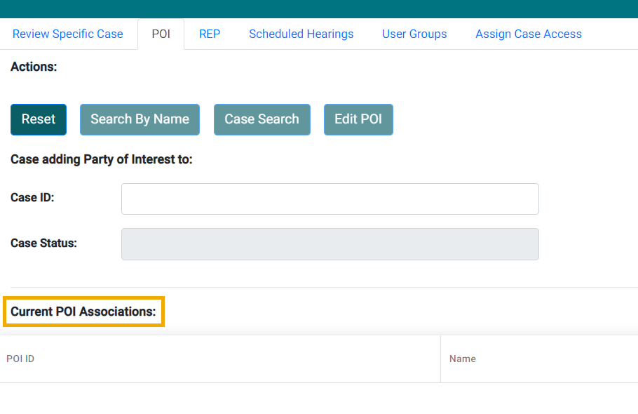 - Verify any current POI associations. If any representatives are already associated with the case, the ID numbers, names, and party of interest type (representative or TPA) are displayed under Current POI Associations.