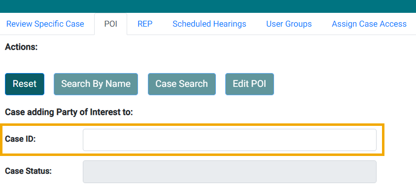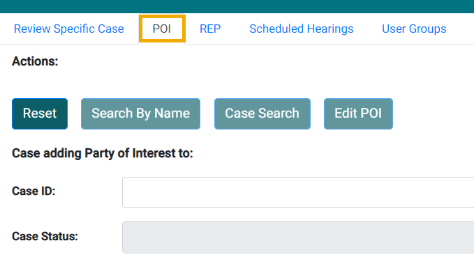 The POI tab allows eCase administrators to add or remove an attorney with a Board-assigned R Number (representative) to and from specific cases. You should first verify the representative is not already associated with the case.