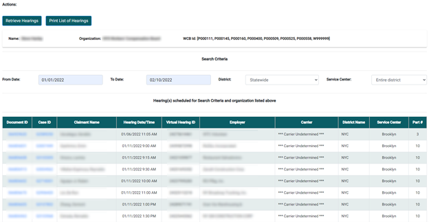 Select the Retrieve Hearings button to start the search based on the criteria just entered.