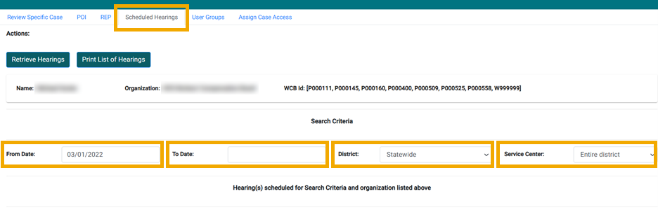 The Scheduled Hearings tab allows eCase administrators to see all scheduled hearings for a selected Board district or service center. Only eCase administrators for organizations that have a POI ID code on notice (R, W, T Number, etc.) will have access to this.