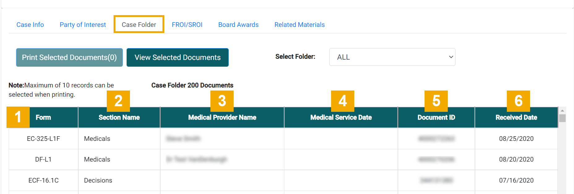 Case Folder: This tab contains documents related to the case either sent or received by the Board. This includes document versions of the First Report of Injury (FROI) and Subsequent Report of Injury (SROI) transactions submitted by claim administrators.