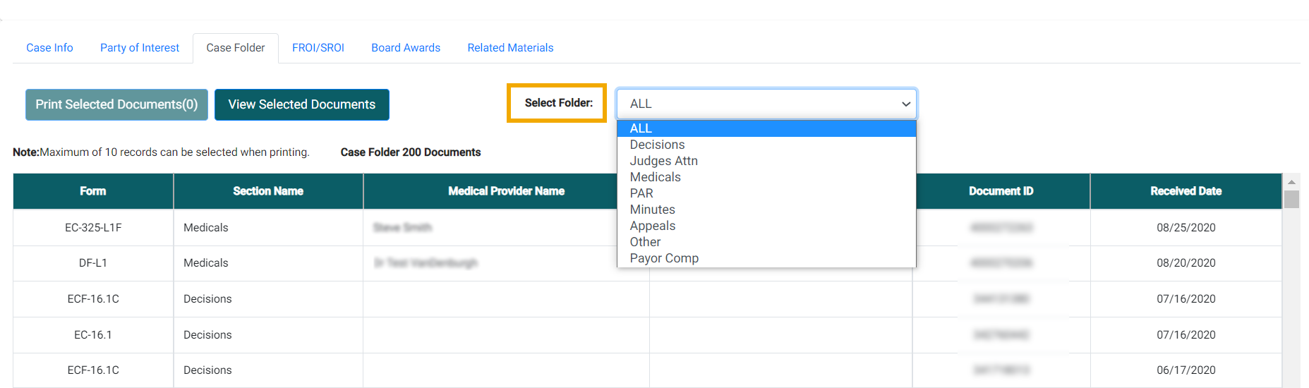 - If you are looking for a specific type of document, select the appropriate type from the Select Folder dropdown located at the top of the case folder. This will filter the list to show those documents specific to that section name.