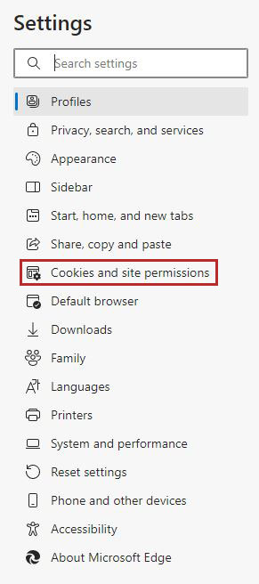 - On the left side of the screen, select Cookies and site permissions.