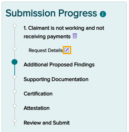 To edit request details, select the pencil icon shown on the Submission Progress panel.