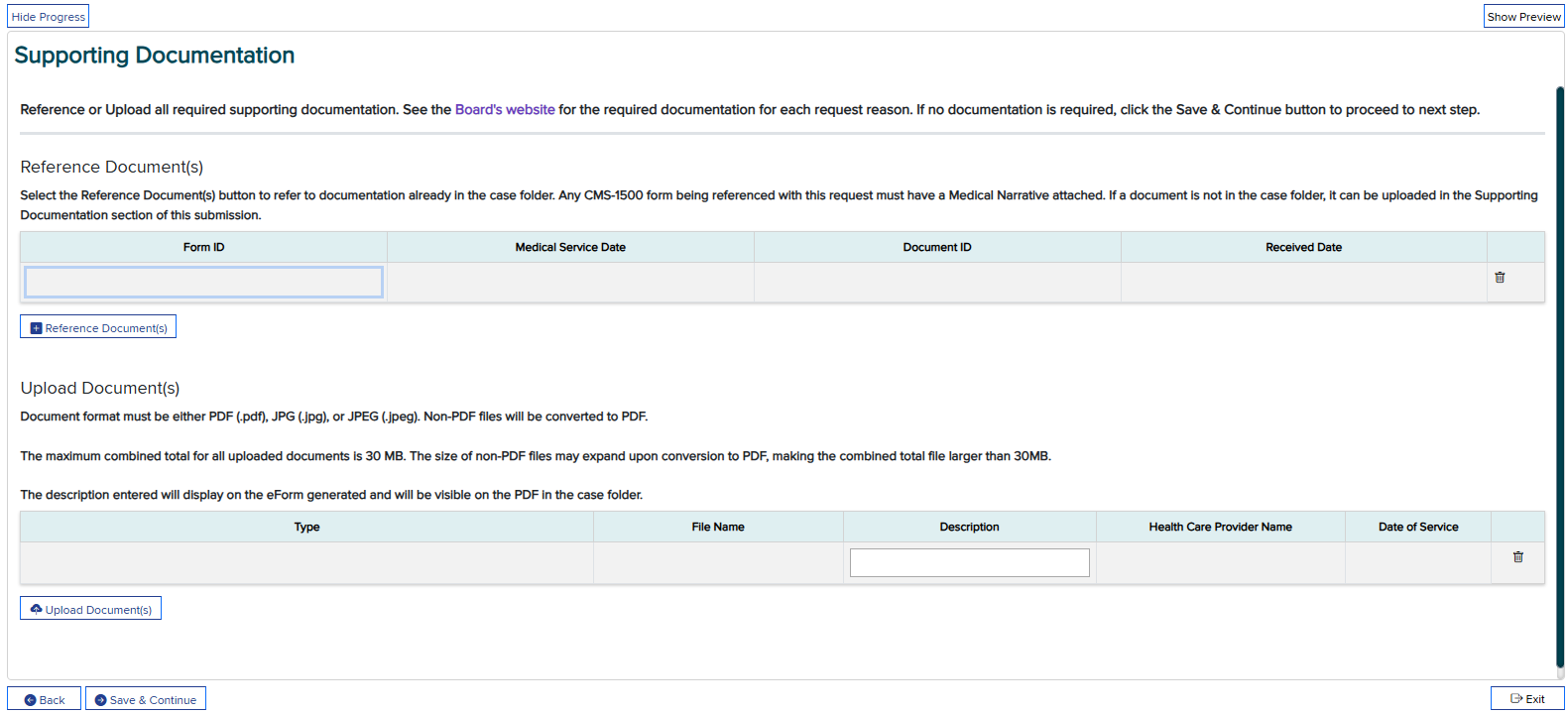 Use the Required Document Matrix file from the Requirements and examples section above to assist you in determining if supporting documentation will be needed (referenced or uploaded).