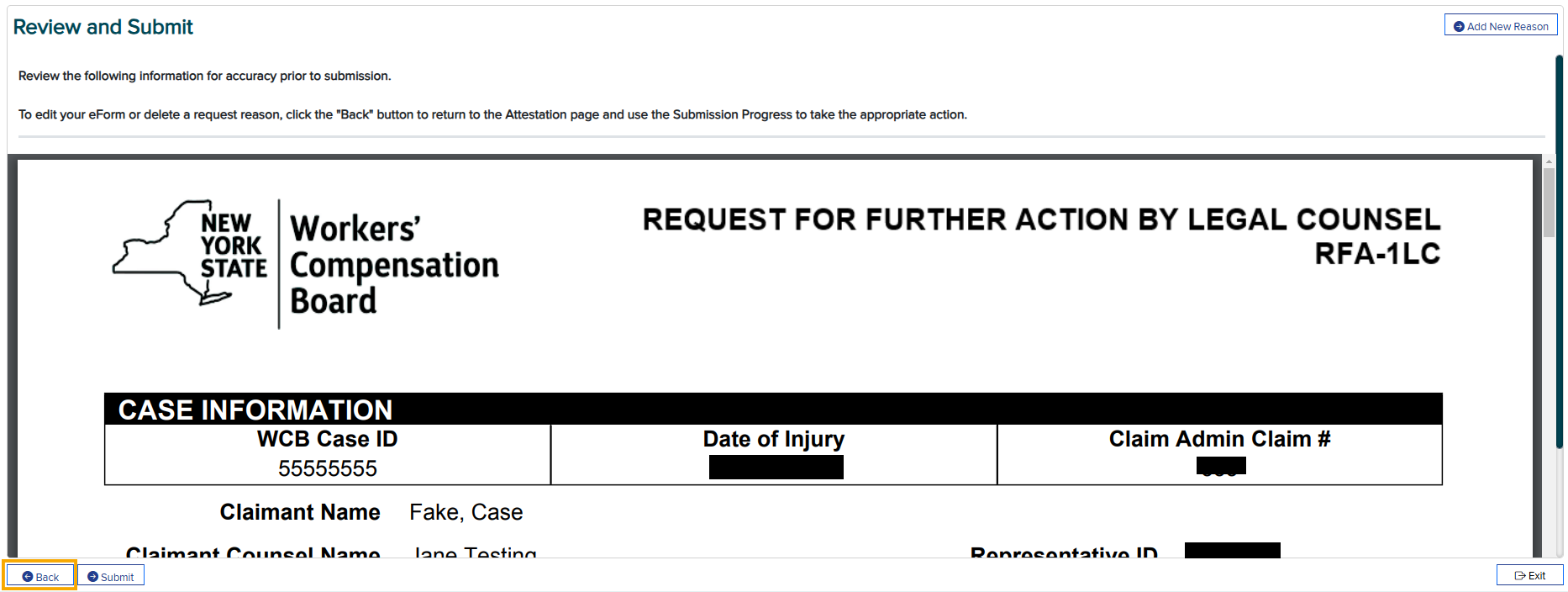 | RFA-1LC | Request for Further Action by Legal Counsel | Claimant's representative | Electronically filed with the Workers' Compensation Board, with PDF copy to employer's insurance carrier or directly to employer or third-party administrator if employer is a Board-approved self-insurer. | The form may be filed at any time after the assembly or indexing of a claim or after the Board has indicated that no further action (NFA) will be taken. |