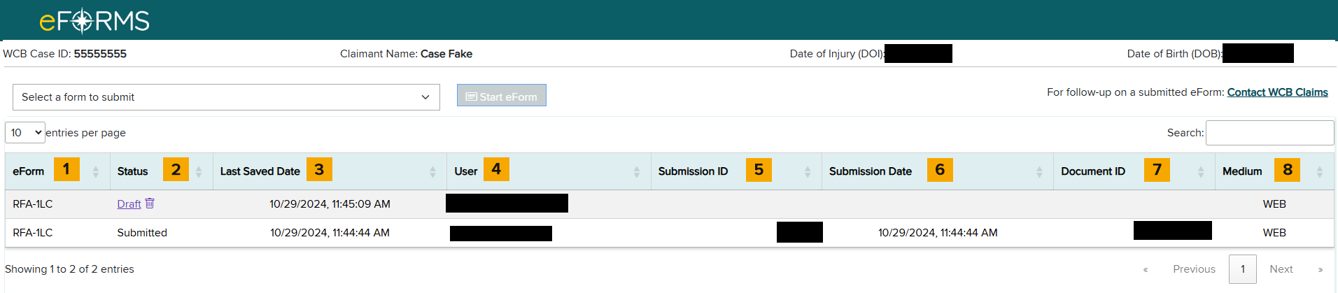 - Status (eForm statuses are Submitted, Rejected, and Draft)