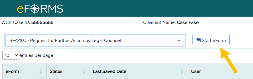Once logged into eCase, and a case number is entered, claimant attorneys and licensed representatives will see an eForm button.