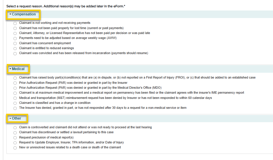 The new RFA-1LC retained the original three request categories (Compensation, Medical, and Other). Each category will have applicable request reasons that have been revamped for clarity and to obtain more details to ensure efficient processing.