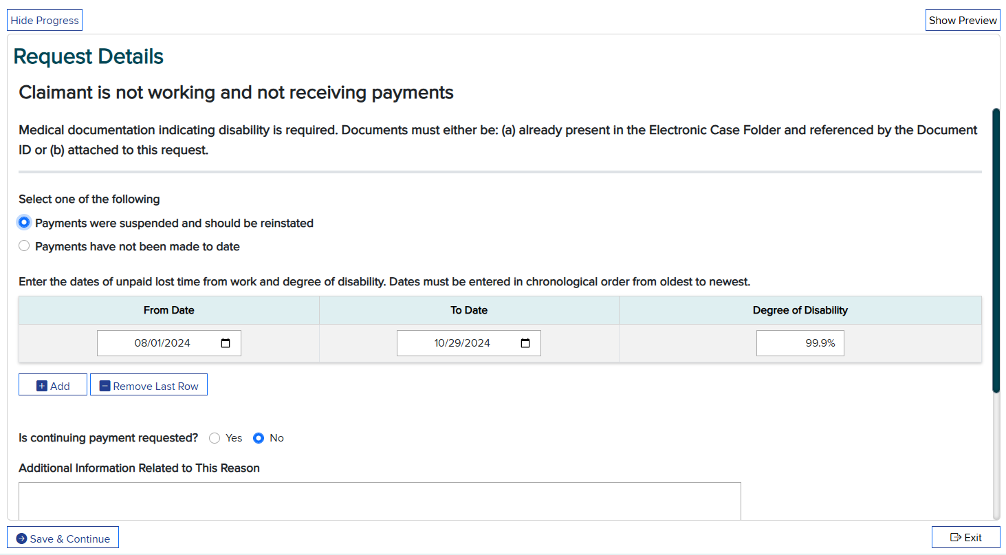 In the example below, the request reason "Claimant is not working and not receiving payments" will require you fill in the payment and lost time information and whether an expedited hearing is requested. Select Save & Continue when you are finished.