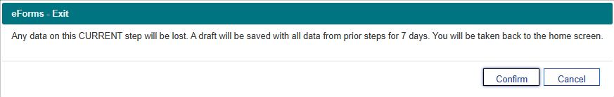 You can save a draft or exit at any point while filling out the eForm. When you select Exit, the message window below displays on the screen. If you select "Confirm," you are acknowledging that the progress on the current step you are on will be lost and a draft with all previously completed information will be saved.