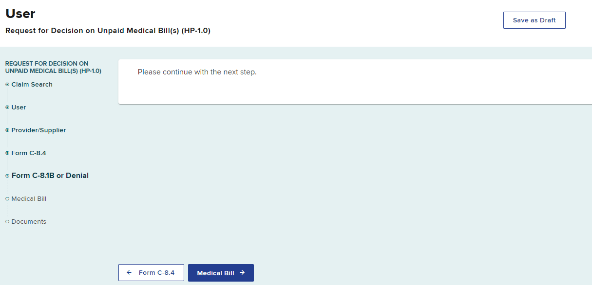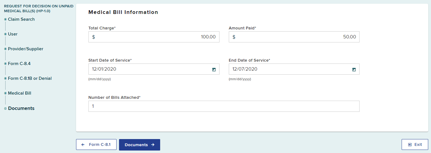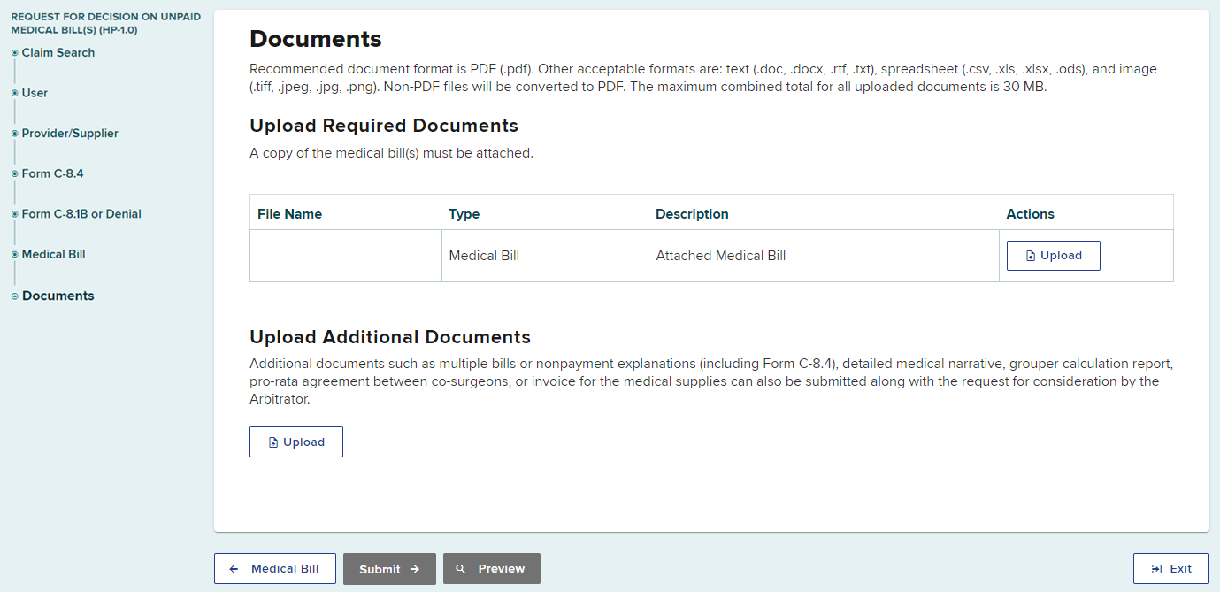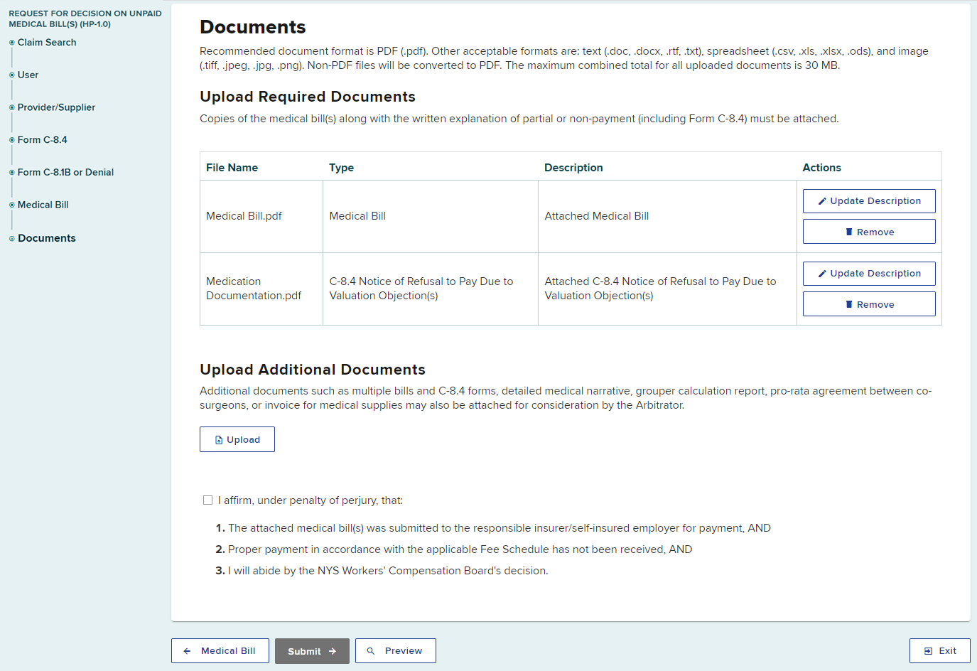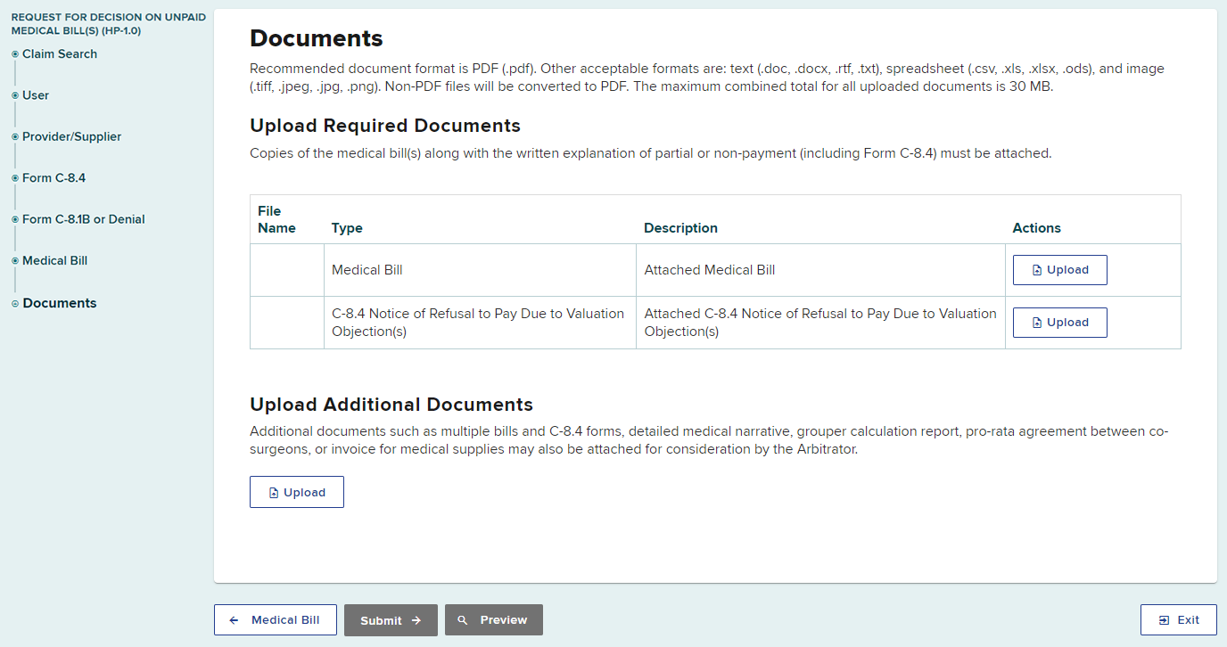 If you are submitting Form HP-1.0 due to receiving Form C-8.4, you are required to upload a copy of the medical bill and Form C-8.4. If there are multiple medical bills, the additional bills can be uploaded in the Upload Additional Documents section.