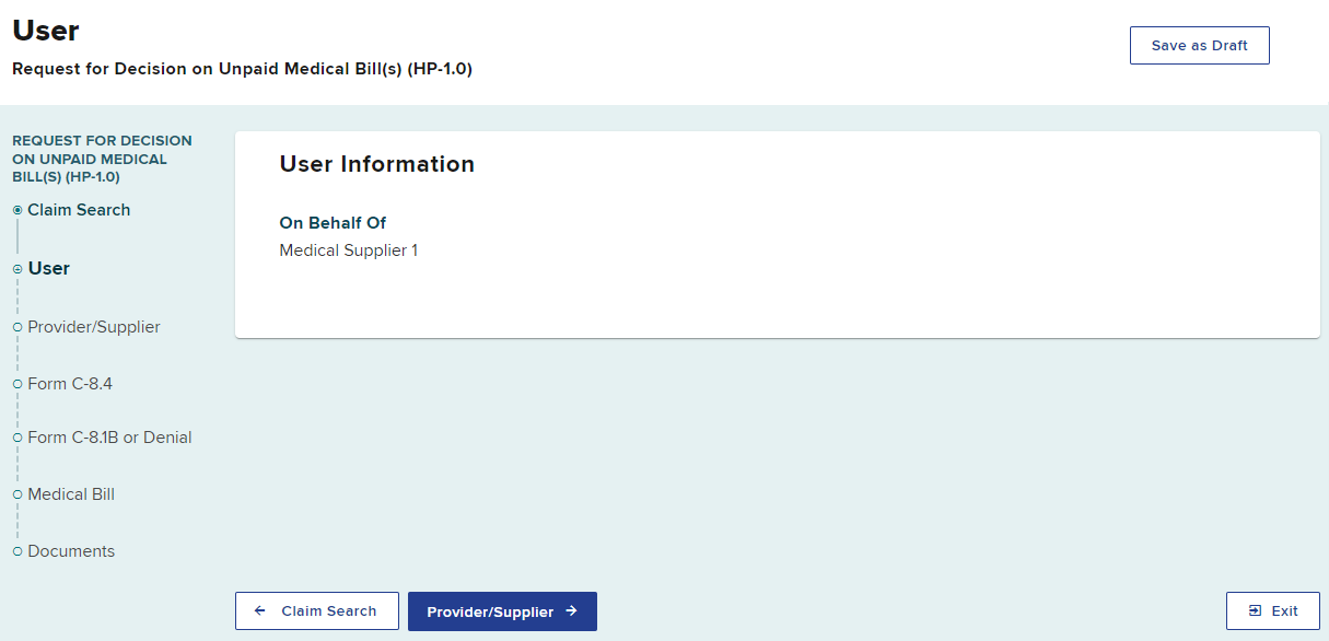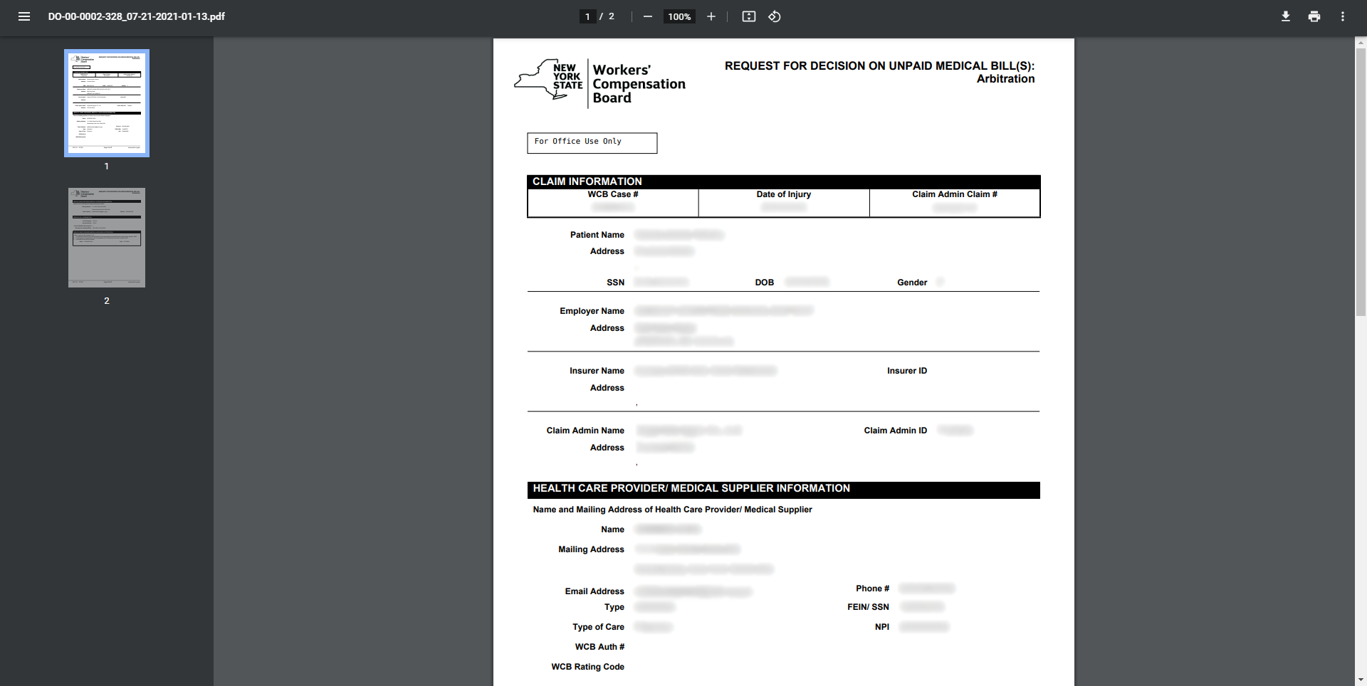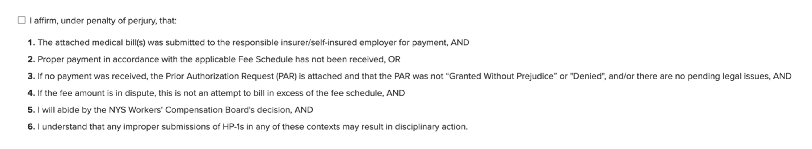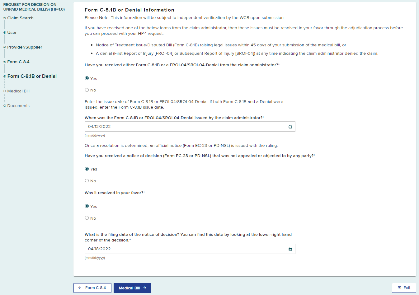 If you are submitting Form HP-1.0 due to receiving Form C-8.4, you are required to upload a copy of the medical bill and Form C-8.4. If there are multiple medical bills, the additional bills can be uploaded in the Upload Additional Documents section.