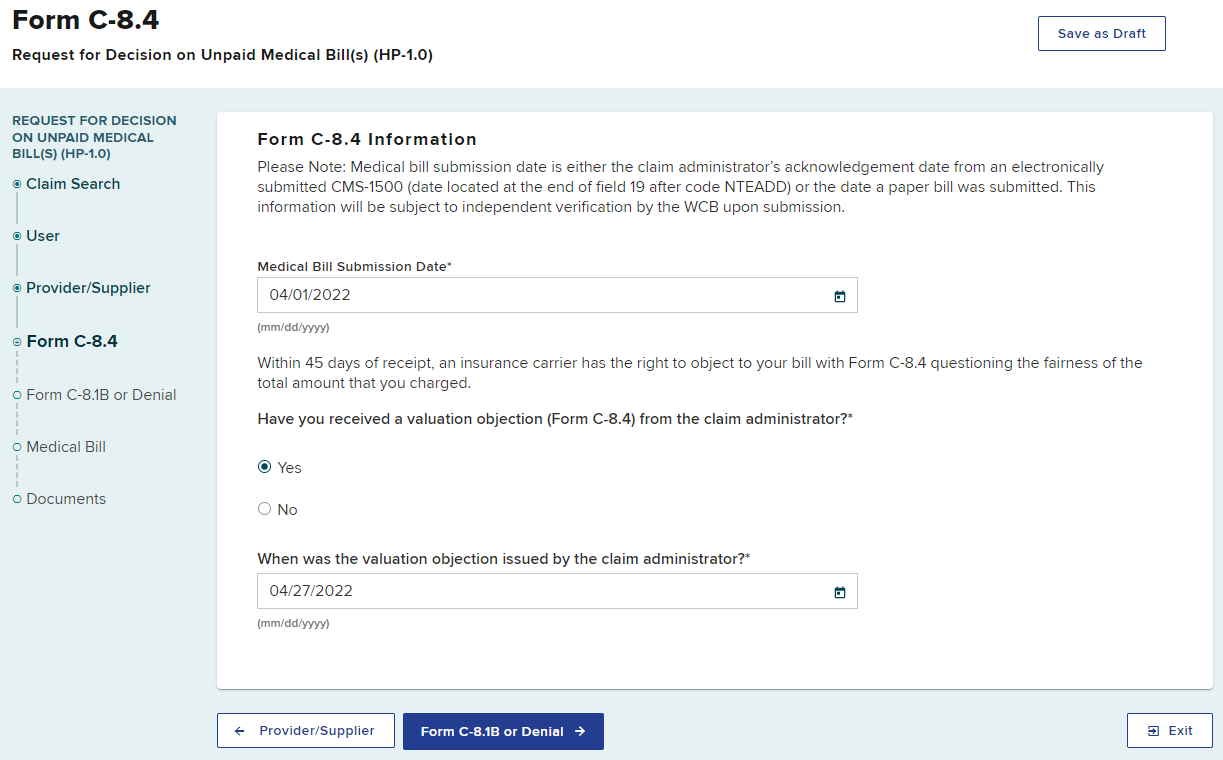 Enter the Medical Bill Submission Date and indicate whether you received a valuation objection (Form C-8.4) from the claim administrator. If you have, select Yes and enter the date the valuation objection was issued by the claim administrator. Otherwise, select No.