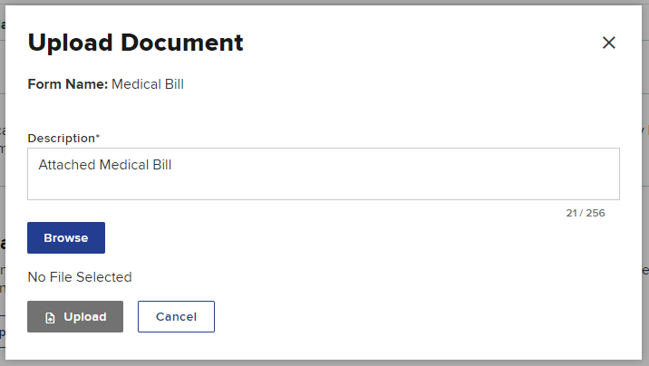You are required to upload a copy of the medical bill. You may upload additional documents, if necessary, in the Upload Additional Documents section.