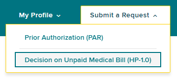 From your OnBoard dashboard, select the Submit a Request button on the top right and select Decision on Unpaid Medical Bill (HP-1.0).