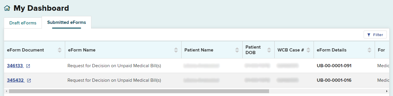 On your OnBoard dashboard, your submitted form, and any HP-1.0 forms submitted by other users for the medical supplier, will appear in the Submitted eForms tab.