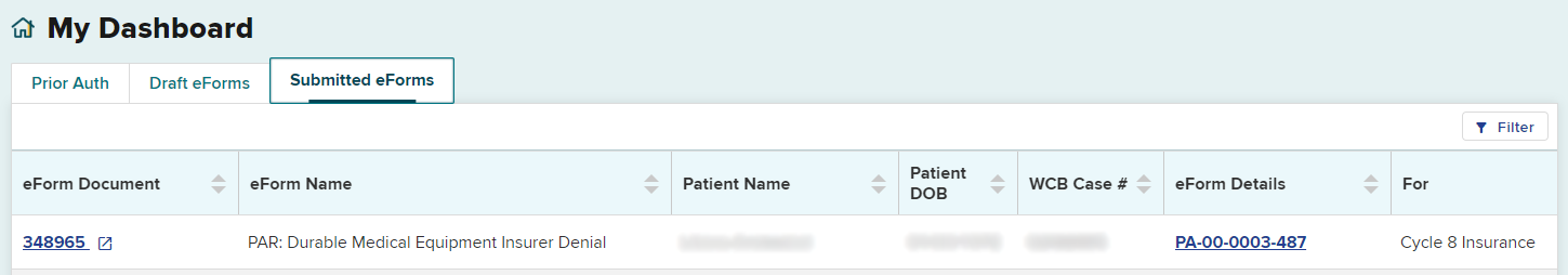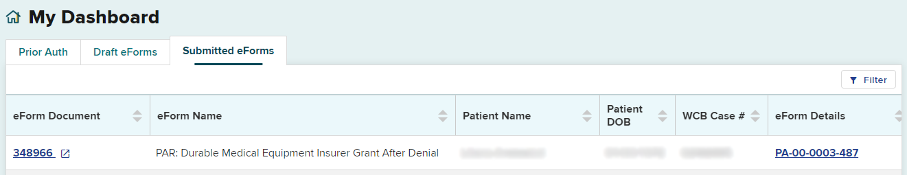 In the Submitted eForms tab, the PAR response will be updated under eForm Name with Grant After Denial or Grant after Grant in Part as appropriate.