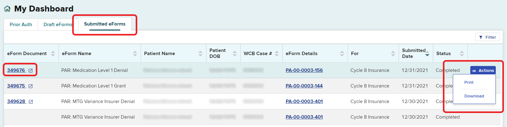 You can access the documents by selecting the link to the PAR ID from the Prior Auth > My PARs and Resolved tabs, or the eForm Document link from the Submitted eForms tab.