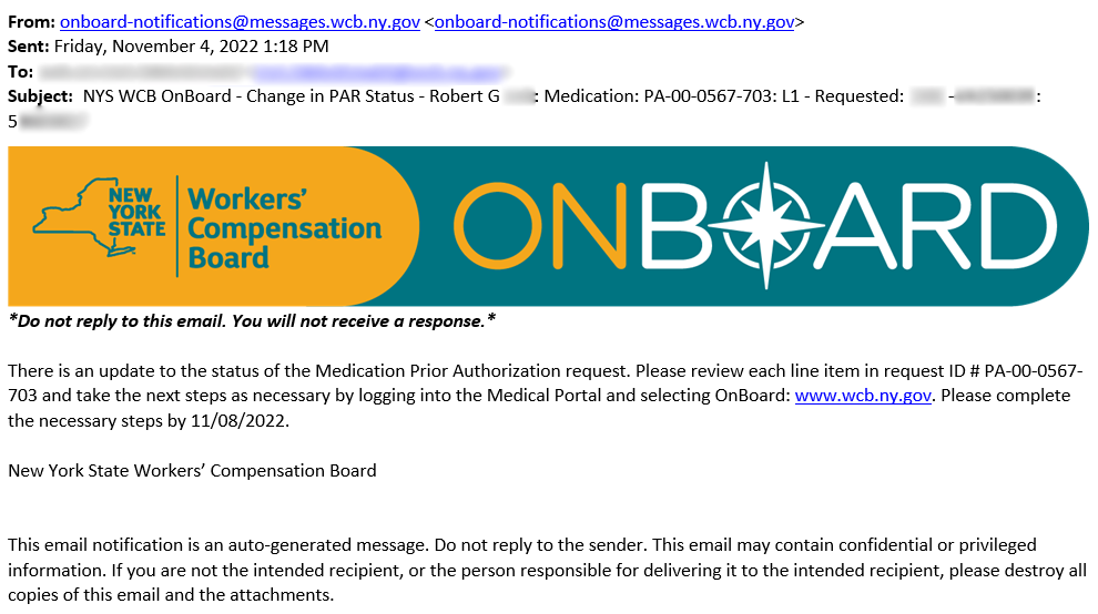 When there is a change to a PAR status in OnBoard, users who have selected to receive email notifications will receive an email which includes the notification of PAR status change, claimant name, PAR type, PAR ID number and Claim Admin Claim Number.