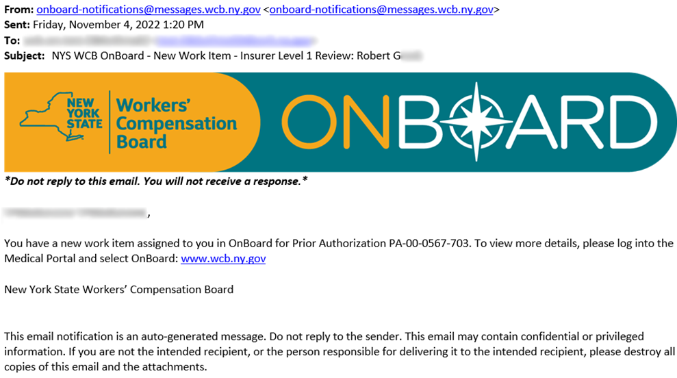 When there is a new PAR assignment added to your queue, users who have selected to receive email notifications will receive an email, like the example below, which includes notification of the new work item and the claimant's name.