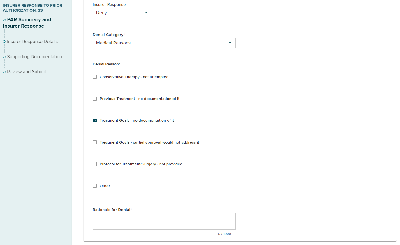 - The options for Denial Reason are dependent upon the Denial Category selected.