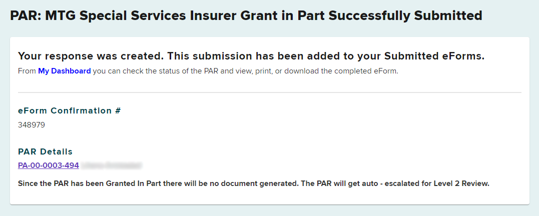 After the submission, a confirmation page will show the PAR was granted in part. You can print, download, or view the complete eForm.