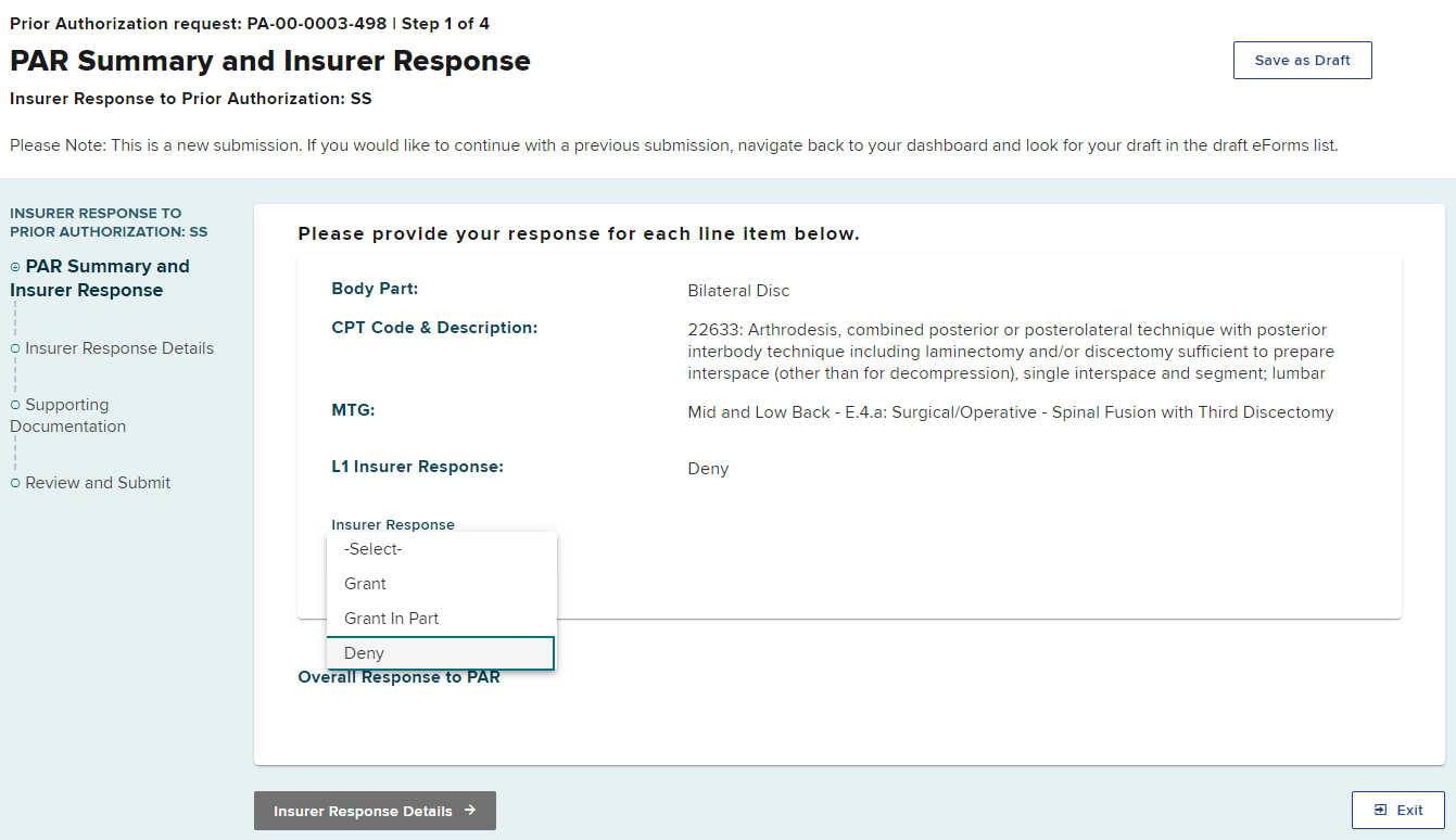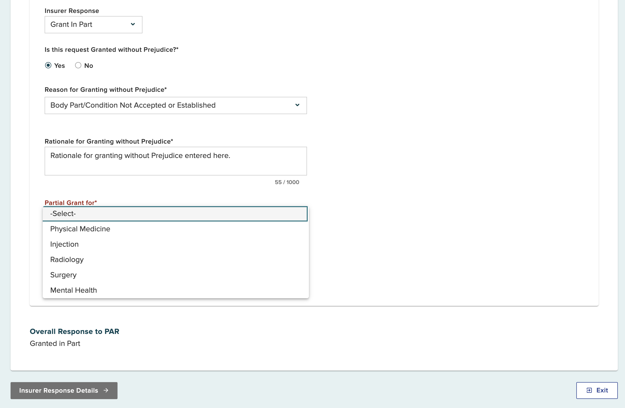 On the PAR response eForm, select the Insurer Response drop-down list and select Grant.