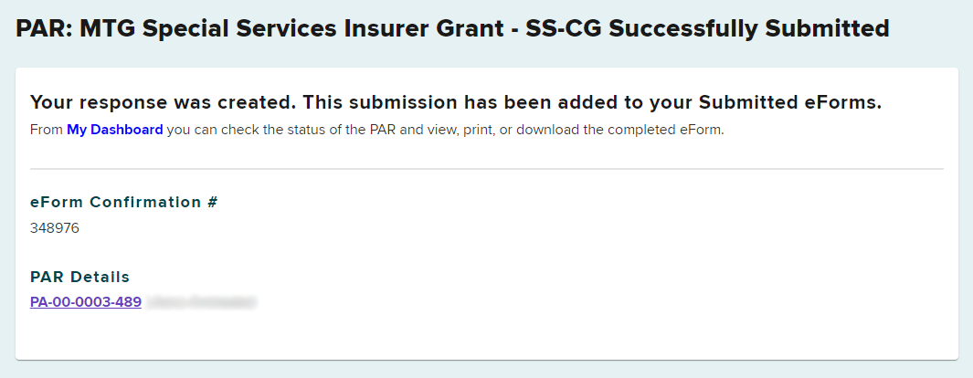 After the submission, a confirmation page will show the PAR was granted. You can print, download or view the complete eForm.