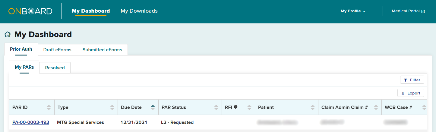 On the dashboard, the Prior Auth > My PARs tab will update with new prior authorization requests (PARs) that require a Level 2 Review. The PAR Status column indicates the level of review needed. The Due Date column is the date the payer is required to respond. If the payer does not respond within the designated time frame, an Order of the Chair may be issued.
