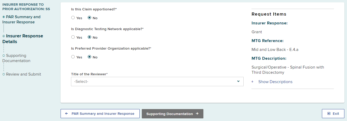 If the claim is apportioned, select Yes and answer the additional required fields. The claim apportionment information included as the PAR response from one payer applies to all, and the apportionment fields allow the insurer to inform the provider of how to bill properly.