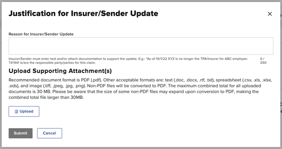You will be redirected to the Justification for Insurer/Sender Update page. After the justification is submitted, the workload administrator will be redirected to the Payer tab and may update the Sender Number (claim administrator) and Claim Admin ID. The Insurer ID will be pre-populated from the PAR and cannot be edited.