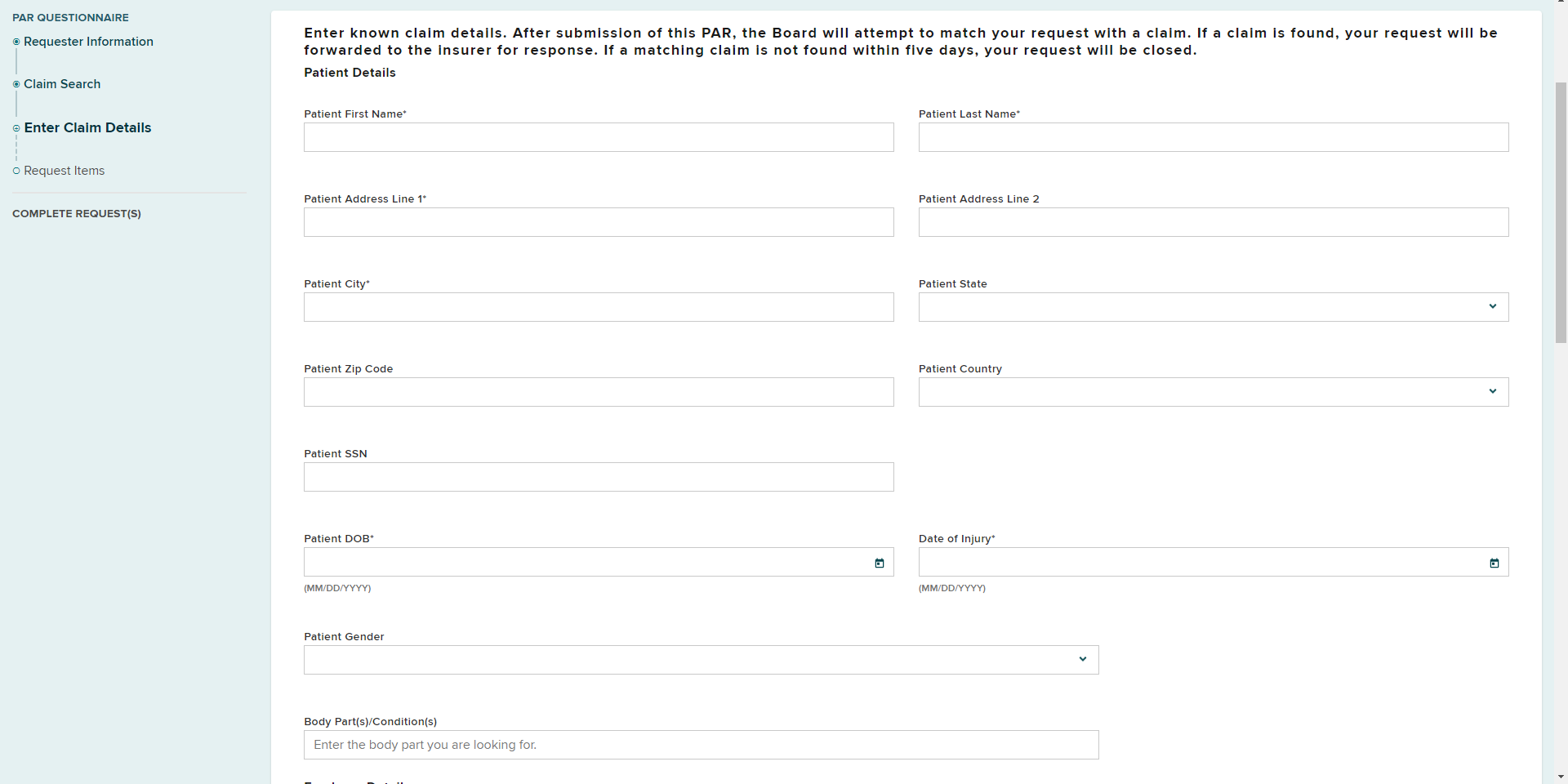 - If a matching claim is not found within five days, your request will be closed, and you will be notified. The patient should then be instructed to submit a claim and notify their employer of their injury.