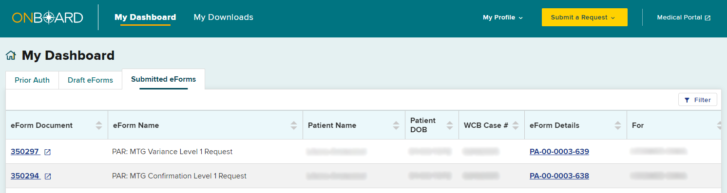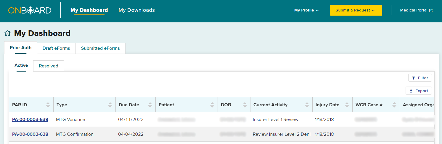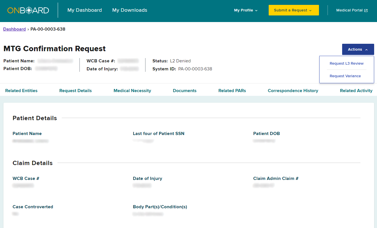 When an MTG Confirmation has been denied by the claim administrator’s Level 2 reviewer, the PAR row on the dashboard will change to bold. To convert the denied MTG Confirmation to an MTG Variance, select the PAR ID link.