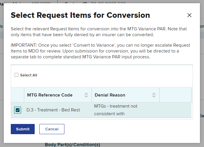 A pop-up will appear for you to select the MTG Confirmation PAR item(s) you want to change to an MTG Variance PAR. If more than one item was denied on the MTG Confirmation PAR, you can select specific items or select all then select Submit.