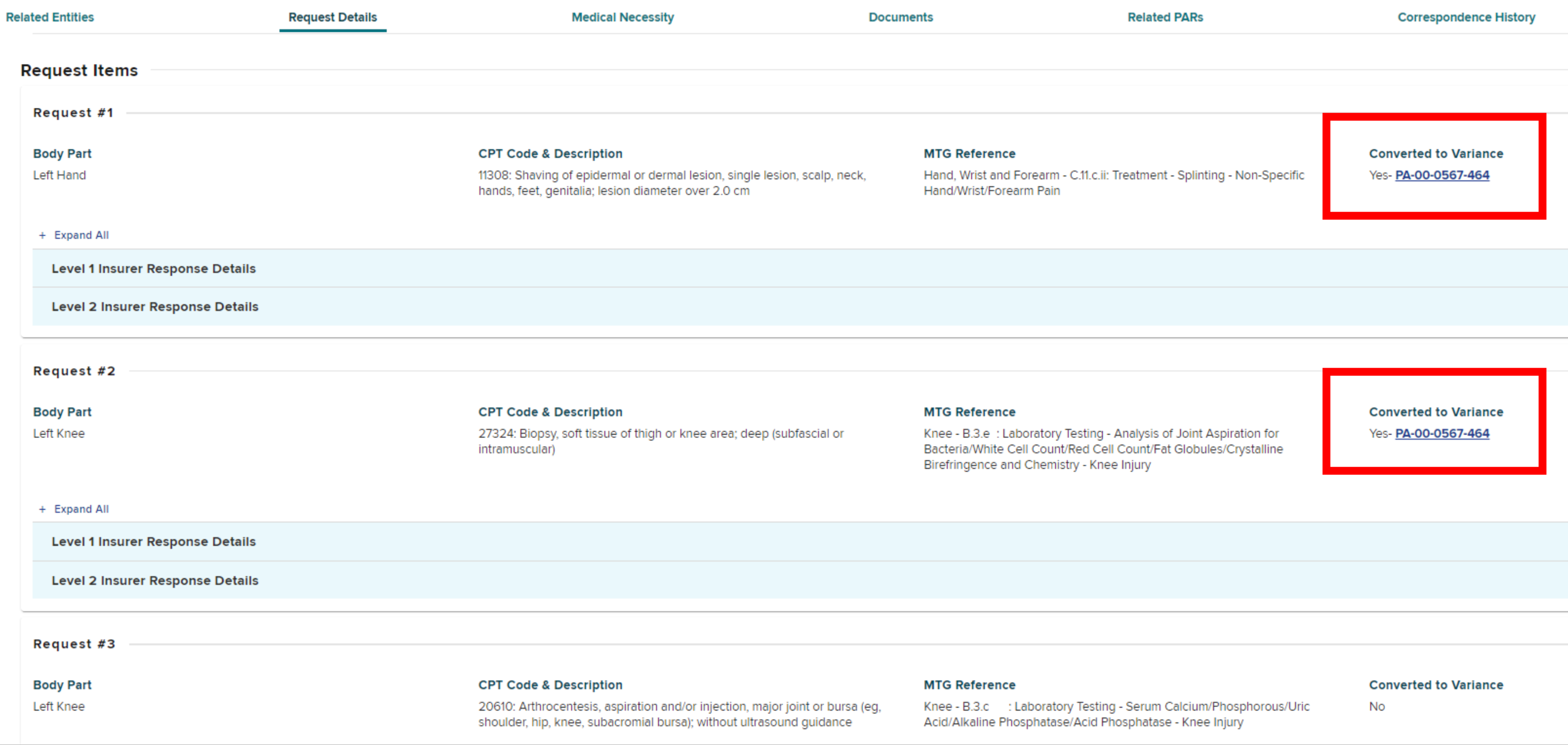If a prior authorization request contains multiple request items and a provider has converted one or more MTG Confirmations to MTG Variances, those request items will show "Converted to Variance" as Yes and contain a link to the Variance request.