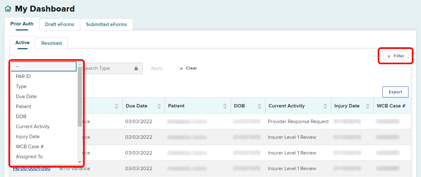 The Prior Auth > Active table columns starting from the left are: PAR ID, Type, Due Date, Patient, DOB, Current Activity, Injury Date, WCB Case #.