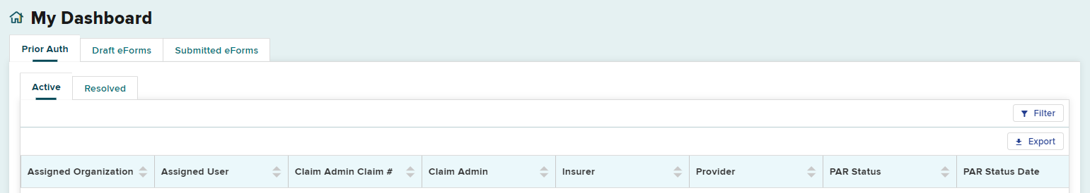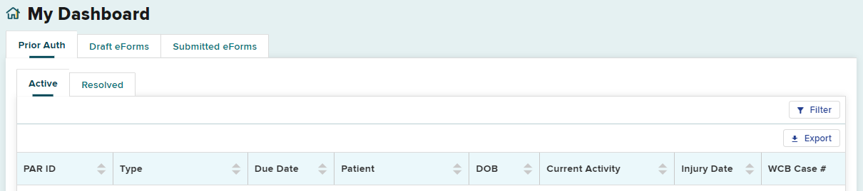 The home screen for OnBoard is a view of My Dashboard, which will allow you to access all active, resolved, drafted and submitted prior authorization requests (PARs). The default view is the Prior Auth > Active tab. The My Dashboard link in the navigation menu will take you to the home screen.
