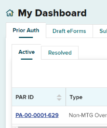 After a PAR is submitted, the PAR will be moved from the Draft eForms tab, to both the Submitted eForms tab and the Prior Auth > Active tab for the provider and all delegated users.