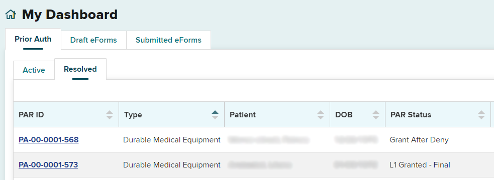 Final decisions on PARs from the claim administrator or the Board's Medical Director's Office will not appear under the Active tab. Instead, they will appear under the Resolved tab.