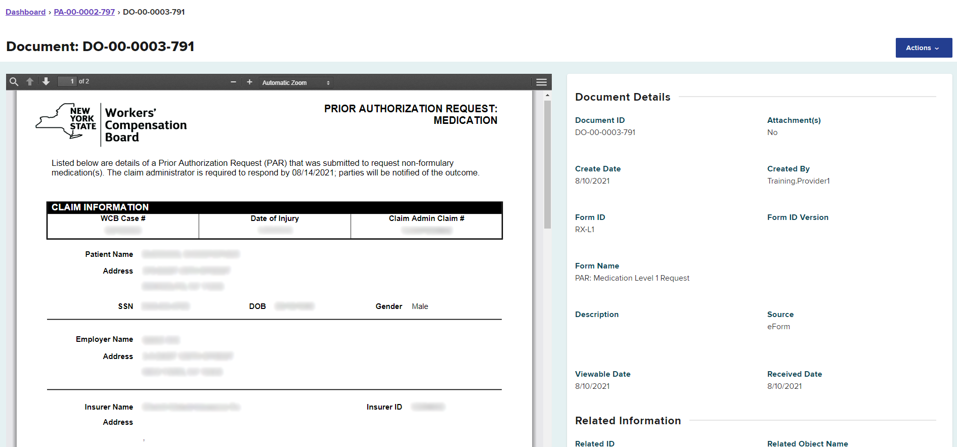The Documents section will update with a new generated eForm when a PAR has been submitted or responded to in OnBoard. Documents the provider or their delegate may attach when submitting a PAR or responding to a request for information from the claim administrator will also appear in this list, along with any documents that are attached by the claim administrator throughout the review process.
