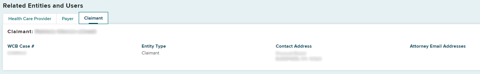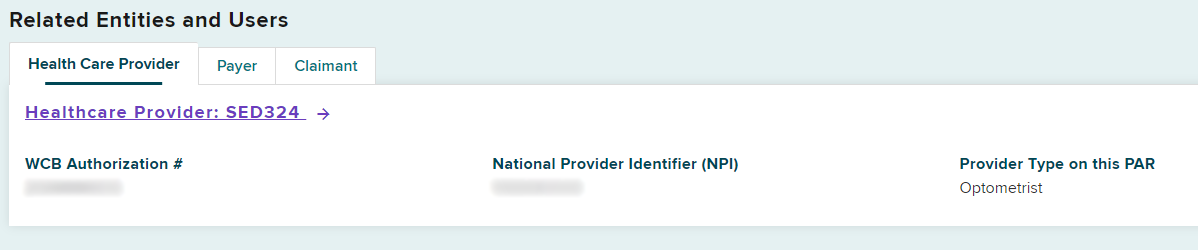 Related Entities and Users will provide the health care provider, payer, and claimant information associated with that PAR. Selecting the link for the health care provider or payer from the Related Entities and Users tab will take you to that entity's information page.